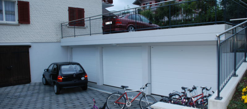 Für diesen Garagenanbau haben wir eine sinnvolle Lösung geplant und ausgeführt, bei der die Garagen von unten zugänglich sind. Auf den Garagen befindet sich zudem ein sehr geschätzter Autoabstellplatz.